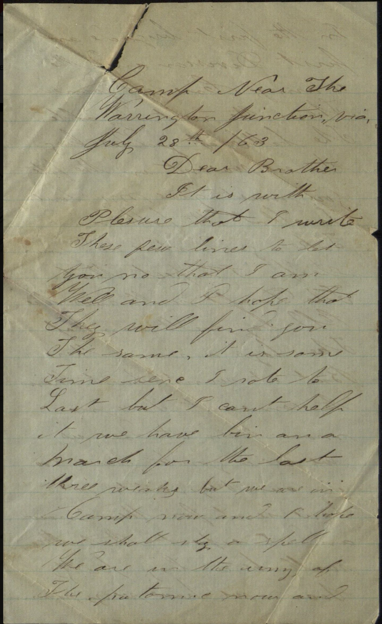 It is with pleasure that I write these few lines to let you know that I am well and I hope that they will find you the same. It is some time since I wrote to you last but I can’t help it. We have been on a march for the last three weeks but we are in camp now and I hope we shall stay a spell. We are in the Army of the Potomac now and in the First Brigade and First Division and the 11th Army Corps. We joined them the next day after the Battle of Gettysburg so we wasn’t in the fight.