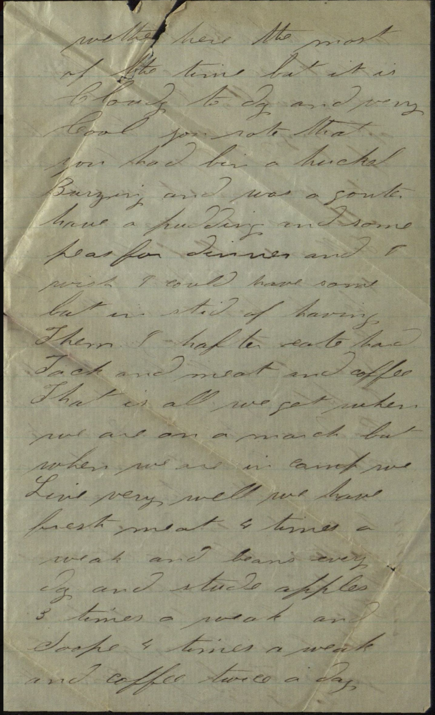 You wrote that you had been a huckleberrying and was a going to have a pudding and some peas for dinner and I wish I could have some but instead of having them, I have to eat hard tack and meat and coffee. That is all we get when we are on a march but when we are in camp we live very well. We have fresh meat 4 times a week and beans every day and stewed apples three times a week and soup 4 times a week and coffee twice a day and whiskey twice a week so we get along very well.
