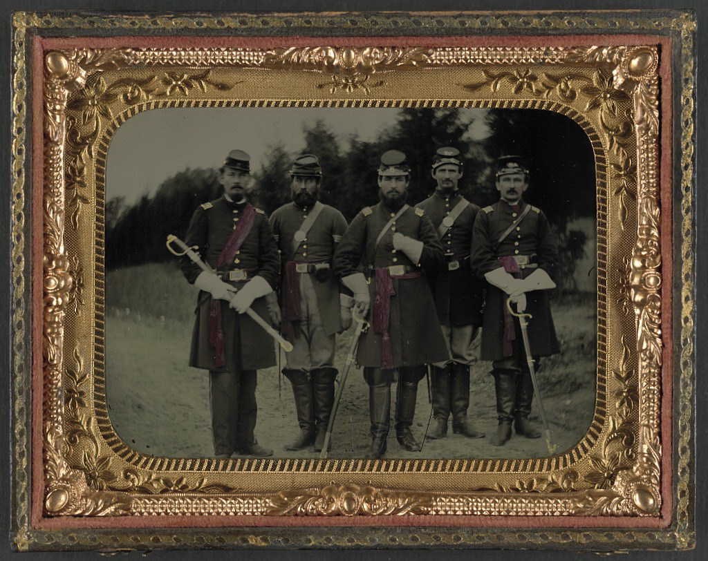 Capt. James H. Walter of Co. G, 138th P. V. stands at center. Lt. George W. Mullen stands at left holding his sword laterally. Lt. George W. Wilson stands at right holding sword vertically. Sergeants William Cline and Nicholas Wilson stand behind. Photograph taken at the Relay House in Maryland in 1862. Library of Congress.