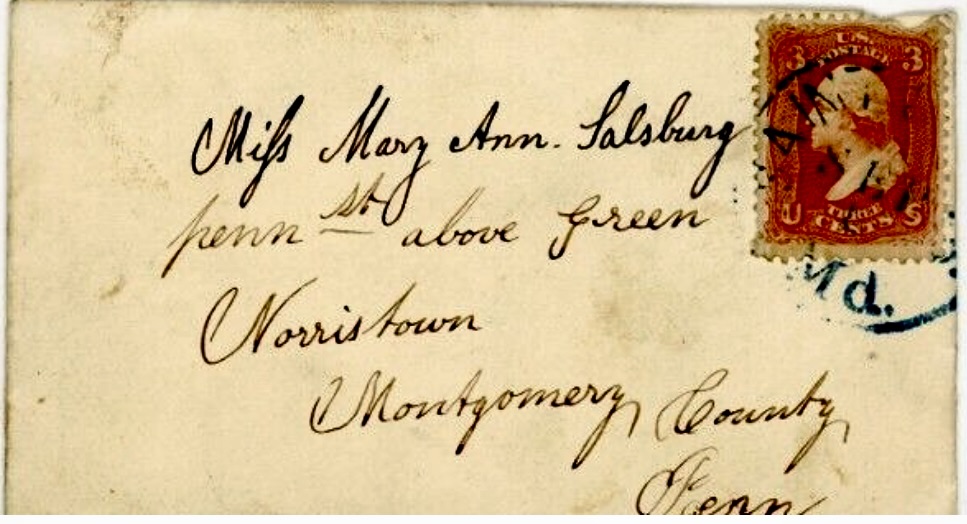 Addressed to Miss Mary Ann Salsburg, Pennsylvania Street above Green, Norristown, Montgomery county, Pennsylvania