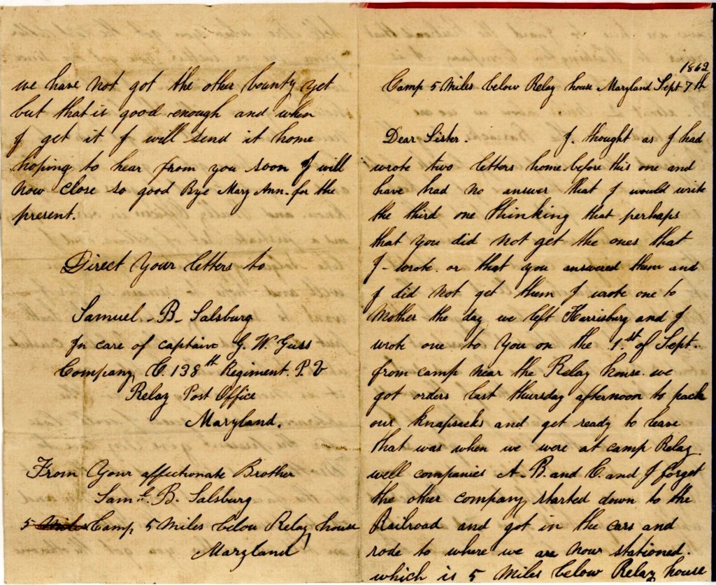 Direct your letters to Samuel B. Salsburg, In care of Captain G[eorge] W[ashington] Guss, Company C, 138th Regiment P. V., Relay Post Office, Maryland