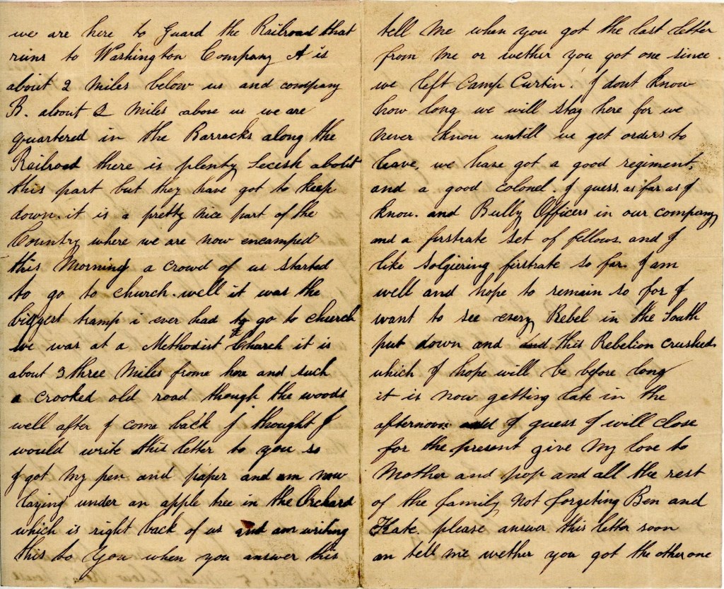 There is plenty secesh about this part but they have got keep down, It is a pretty nice part of the country where we are now encamped. This morning a crowd of us started to go to church, Well, it was the biggest tramp I ever had to go to church. We was at a Methodist Church. It is about three miles from here and such a crooked old road through the woods. Well after I come back, I thought I would write this letter to you so I got my pen and paper and an now laying under an apple tree here in the orchard which is right back of us and am writing this to you. When you answer this, tell me when you got the last letter from me or whether you got one since we left Camp Curtin.