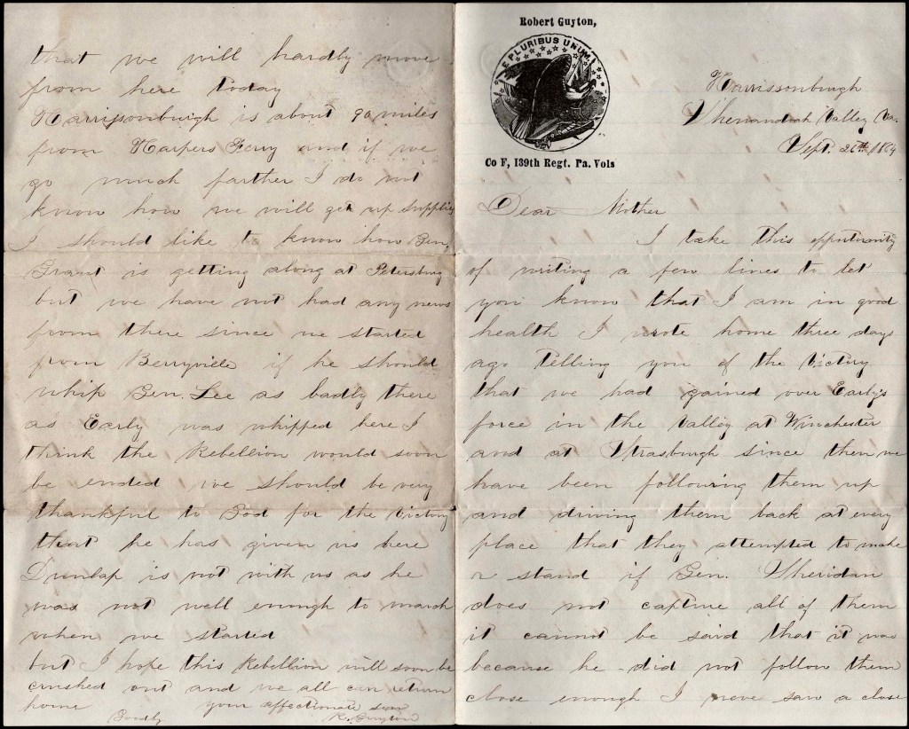 Harrisonburg is about 90 miles from Harpers Ferry and if we go much farther, I do not know how we will get up supplies. I should like to know how Gen. Grant is getting along at Petersburg but we have not had any news from there since we started from Berryville. If he should whip Gen. Lee as badly there as Early was whipped here, I think the Rebellion would soon be ended. We should be very thankful to God for the victory that he has given us here. Dunlap is not with us as he was not well enough to march when we started but I hope this Rebellion will soon be crushed out and we all can return home Goodby. Your affectionate son, — R. Guyton