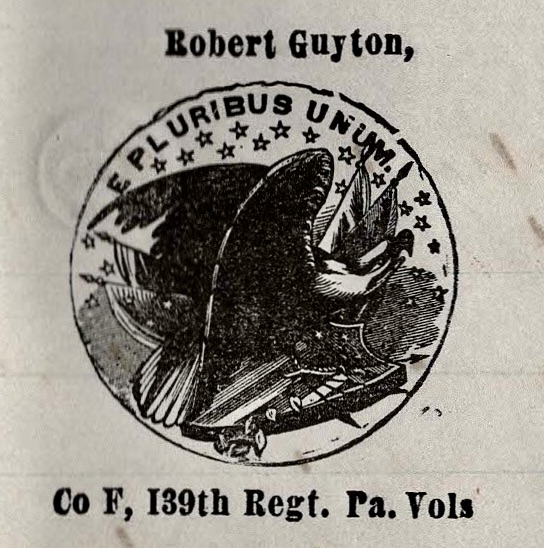 This letter was written by Robert Guyton (1838-1915), the son of John Guyton (1810-1886) and Elizabeth Jane Hazlett (1812-1890) of McCandless, Allegheny county, Pennsylvania. Robert enlisted in Co. F, 139th Pennsylvania Infantry on 1 September 1862. He was promoted from corporal to sergeant in June 1864 and mustered out with the company in June 1865. After the war, Robert returned home, married Nancy A. Robinson (1840-1888), and resumed farming.
