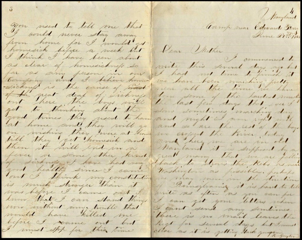 Dear Mother — I commenced to write this several days ago but I had not time to finish it. We have been marching pretty near all the time. We have done some of the hardest marching the last few days that ever I saw — sometimes marching day and night. I am right well and so are the rest of the boys. We crossed the [Potomac] river today and here we are in Old Maryland. It is supposed by a great many that we are falling back to draw the Rebs as near Washington as possible. Perhaps we may move in the direction of Pennsylvania. It is hard to tell. Write as often as you can for i can get your letters when I can’t send any. Sometimes there is no mail leaves the regiment for several days but I must close as it is getting dark.