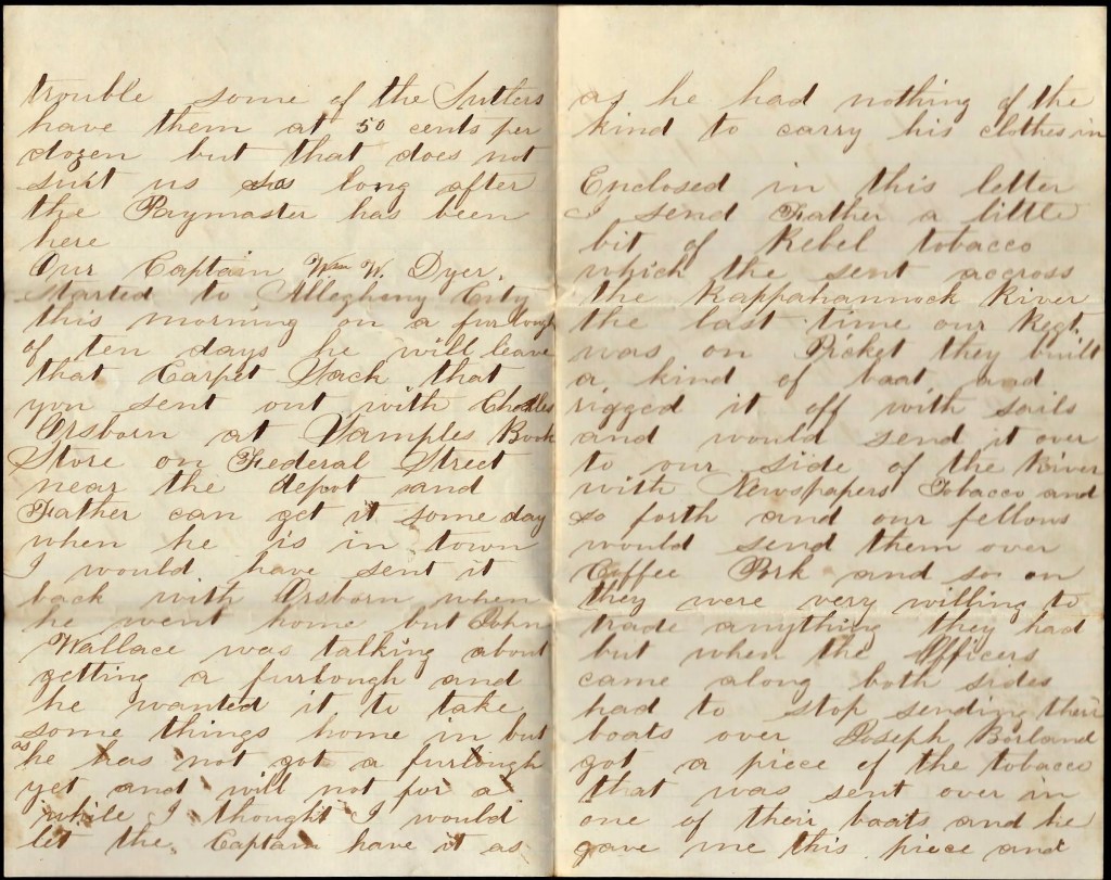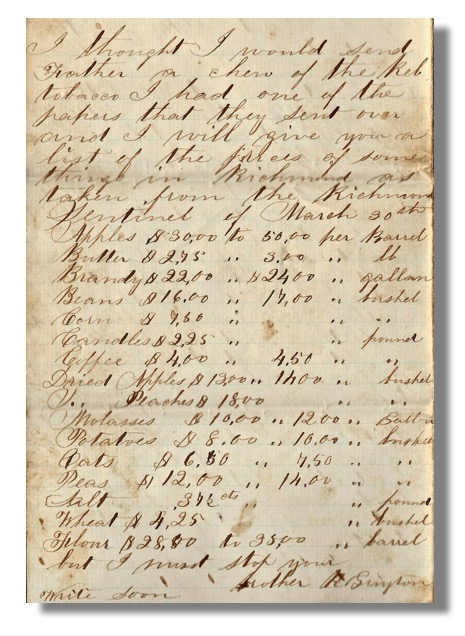 Enclosed in this letter I send Father a little bit of Rebel tobacco which the [Rebels] sent across the Rappahannock river the last time our regiment was on picket. They built a kind of boat and rigged it off with sails and would send it over to our side of the river with newspapers, tobacco, and so forth, and our fellows would sed them over coffee, pork, and so on. They were very willing to trade anything they had but when the officers came along, both sides had to stop sending their boats over. Joseph Borland got a piece of tobacco that was sent over in one of their boats and he gave me this piece and I thought I would send Father a chew of the Reb tobacco. I had one of the papers that they sent over and I will give you a list of the prices of some things in Richmond as taken from the Richmond Sentinel of March 30th.