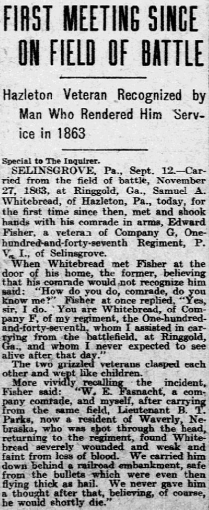 “We marched in line of battle about half way up in the woods when the command was given by the left flank. Captain Davis, who was beside the writer now, left my side to take his place at the left of the Company. Hardly had he gone, when he was mortally wounded and carried off the field by James P. Ulrich and others, whom I have forgotten. Lieutenant B. T. Parks, who then became commander of the company, was in the act of passing the writer to the left of the company, when a bullet struck him in the back of the neck, going entirely thru. I stopped and looked at him but as he never moved a muscle I thought he was dead and passed on. Later Ed Fisher and William E. Fausnaucht found him alive and kicking and carried him off the field. After arriving at the hospital Parks made the boys prop him up and light his pipe for him. Then he made Fisher go after his sword, which he had lost on the battlefield.”