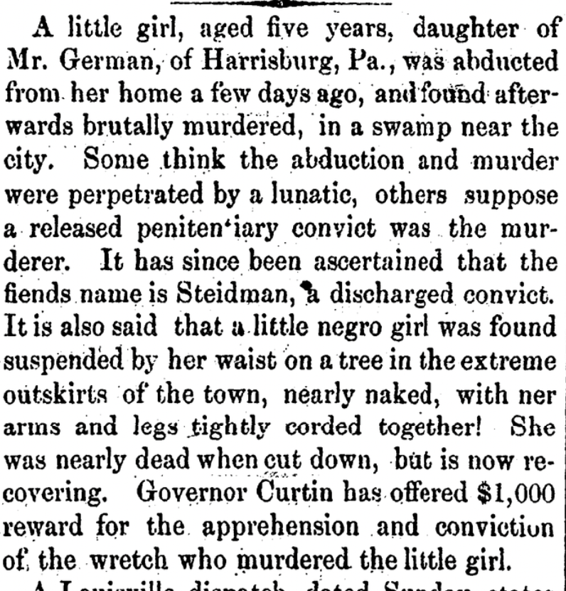 The five year-old girl abducted from her home and murdered was Mary Elizabeth German, the daughter of a Harrisburg book merchant named Emanuel Seltzer German (1822-1912) according to an article appearing in the Alexandria Gazette on 7 October 1862 (see footnote).