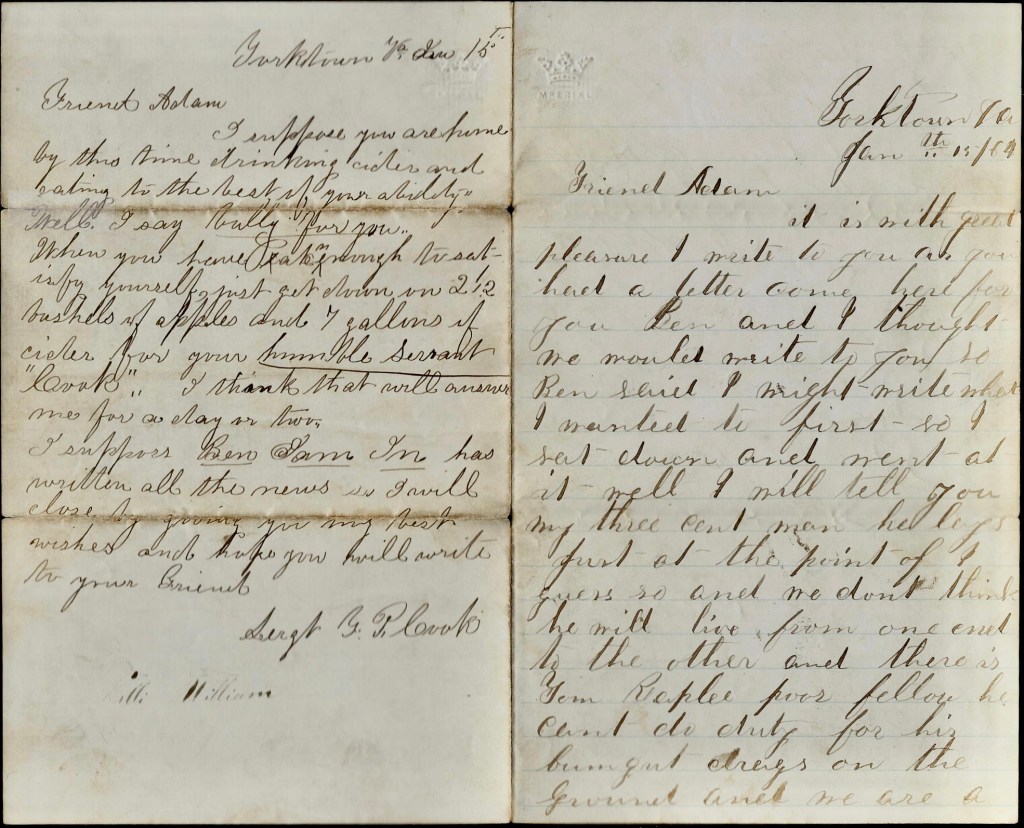 Last week there was a party of us went out on a scouting expedition where the citizens had never seen a Yankee soldier before and if we did not have a fine time. I would like to have had you with us. You would have enjoyed being a soldier for once if you never did before. In the first place, we started about six o’clock in the morning and marched 25 miles—which by the way was not the pleasantest part of the job—when we halted and took up our quarters in a courthouse for the night. And as luck would have it it, fell on me to take a squad and go out on picket. But of course no one came along for why the poor things were almost scared to death when they found that real live Yankee soldiers were amongst them who they had been told had horns and would hook. Well, perhaps some of them would, or did, I will not attempt to say. But will say this—they all knew how to find chickens and geese, hams, &c., whatever we wanted to eat beside a load to bring back. 1