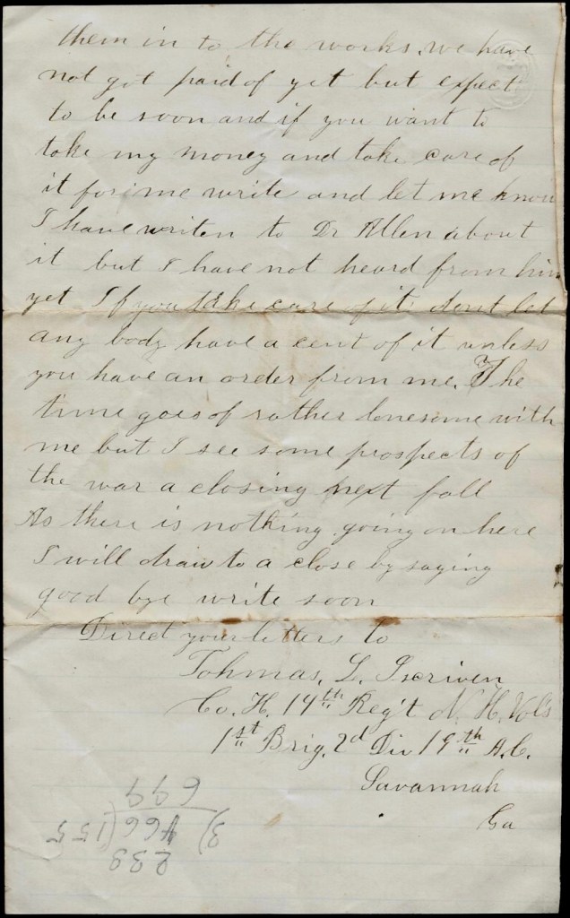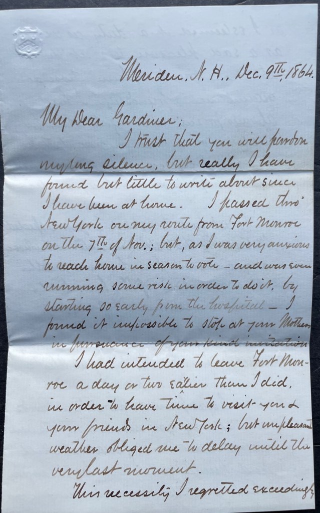 I trust that you will pardon my long silence but really I have found but little to write about since I have been at home, I passed through New York on my route from Fort Monroe on the 7th of November, but as I was very anxious to reach home in season to vote—and was even running some risk i order to do it by starting so early from the hospital—I found it impossible to stop at your Mother’s in pursuance of your kind invitation. I had intended to leave Fort Monroe a day or two earlier than I did in order to have time to visit you & your friend in New York, but unpleasant weather obliged me to delay until the very last moment. This necessity I regretted exceedingly as I esteemed it a duty, as well as a sad pleasure to visit the afflicted friends of him whose acquaintance & friendship I had always prized most highly while he lived, and whose memory now that he has been called away is treasured up among the most valued recollections of the past.