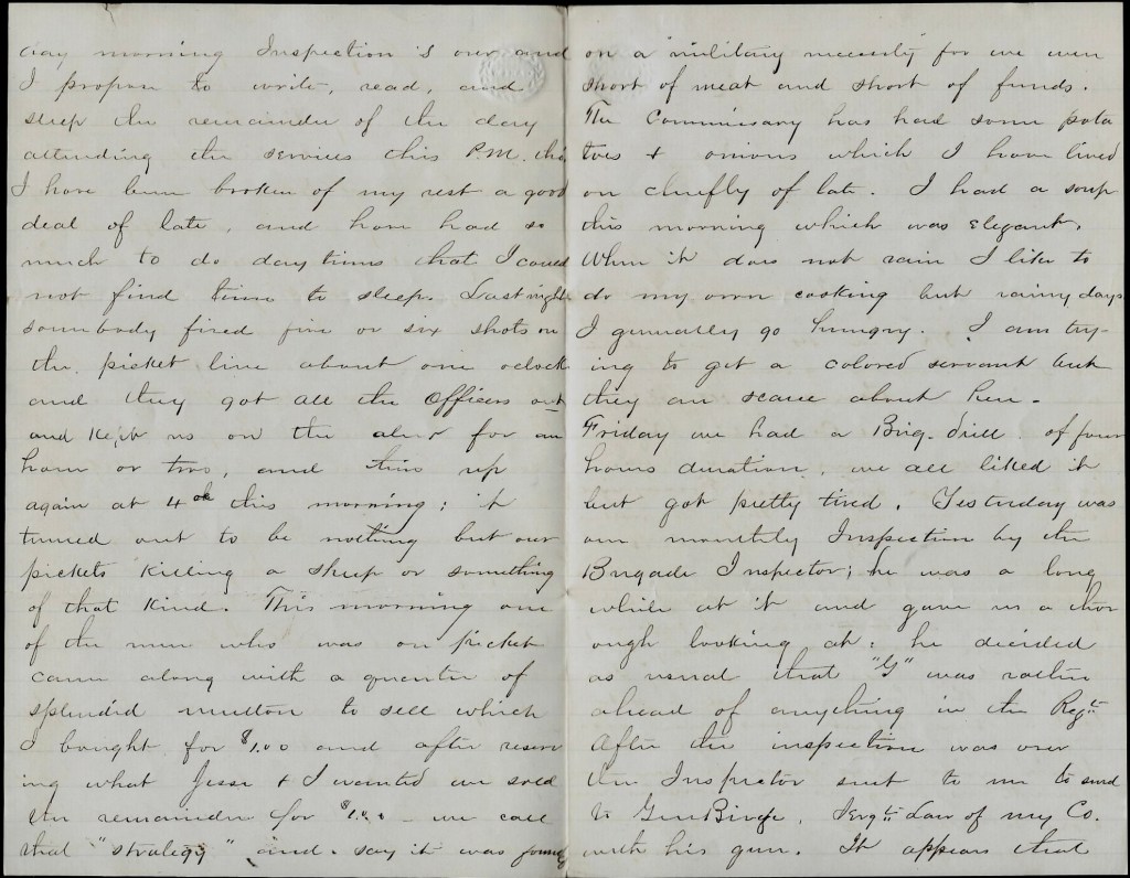 When I left the hospital (Nov. 5th), Lt. Pratt was very low. His case seemed hopeless. His wife was with him & was very calm & resigned, but Col. Ames now writes that Pratt has “weathered the storm” and will recover. I hope so, certainly, for he is a pleasant & companionable officer. But poor Vannays [?] we shall see no more. I think the commander–his staff of the 3rd Brigade—should be satisfied with their record of exposure to danger that day.
