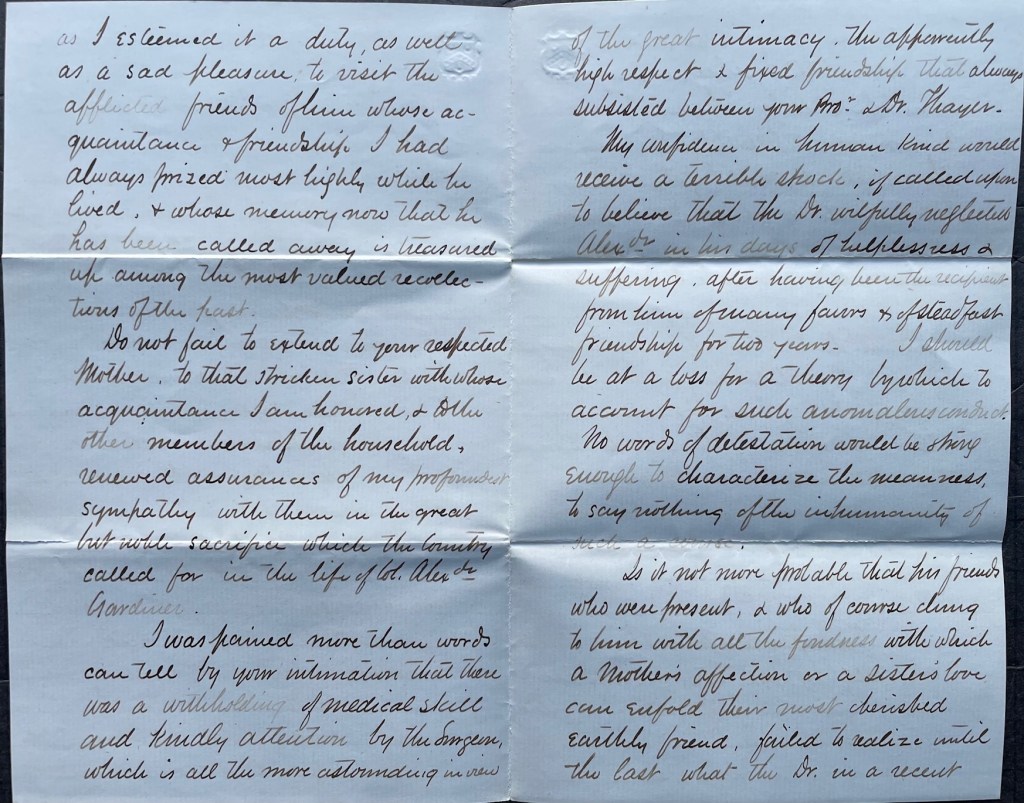 I was pained more than words can tell by your intimation that there was a withholding of medical skill and kindly attention by the surgeon which is all the more astounding in view of the great intimacy, the apparently high respect & fixed friendship that always subsisted between your brother and Dr. [William Henry] Thayer. 1 My confidence in human kind would receive a terrible shock if called upon to believe that the Dr. willfully neglected Alexander in his days of helplessness & suffering after having been the recipient from him of many favors and of steadfast friendship for two years. I should be at a loss for a theory by which to account for such anomalous conduct. No words of detestation would be strong enough to characterize the meanness to say nothing of the inhumanity of such a course.
