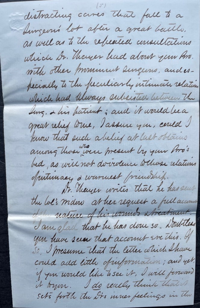 I can but hope that you and all your friends in forming your final estimates in this matter will give due prominence to the multifarious and distracting cares that fall to a surgeon’s lot after a great battle as well as to the repeated consultations which Dr. Thayer had about your brother with other prominent surgeons, and especially to the peculiarly intimate relation which had always subsisted between the surgeon and his patient, and it would be a great relief to me, I assure you, could I know that such a belief at last obtains among those who were present by your brother’s bed, as will notdo violence to thoserelations of intimacy and warmest friendship.