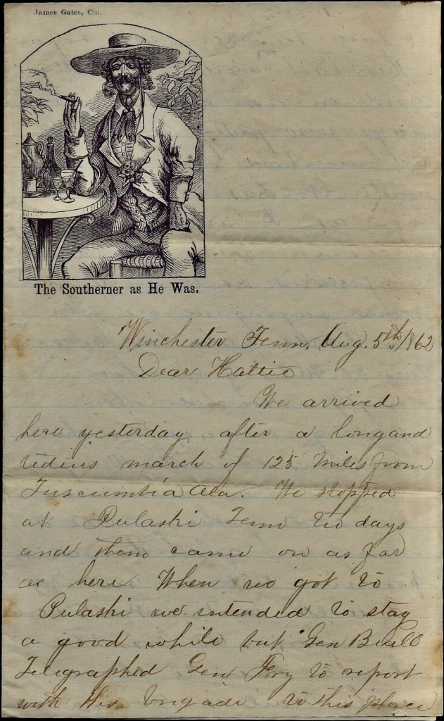 We arrived here yesterday after a long and tedious march of 125 miles from Tuscumbia, Alabama. We stopped at Pulaski, Tennessee, two days and then came on as far as here. When we got to Pulaski, we intended to stay a good while but Gen. Buell telegraphed Gen. Fry to report with his brigade to this place.