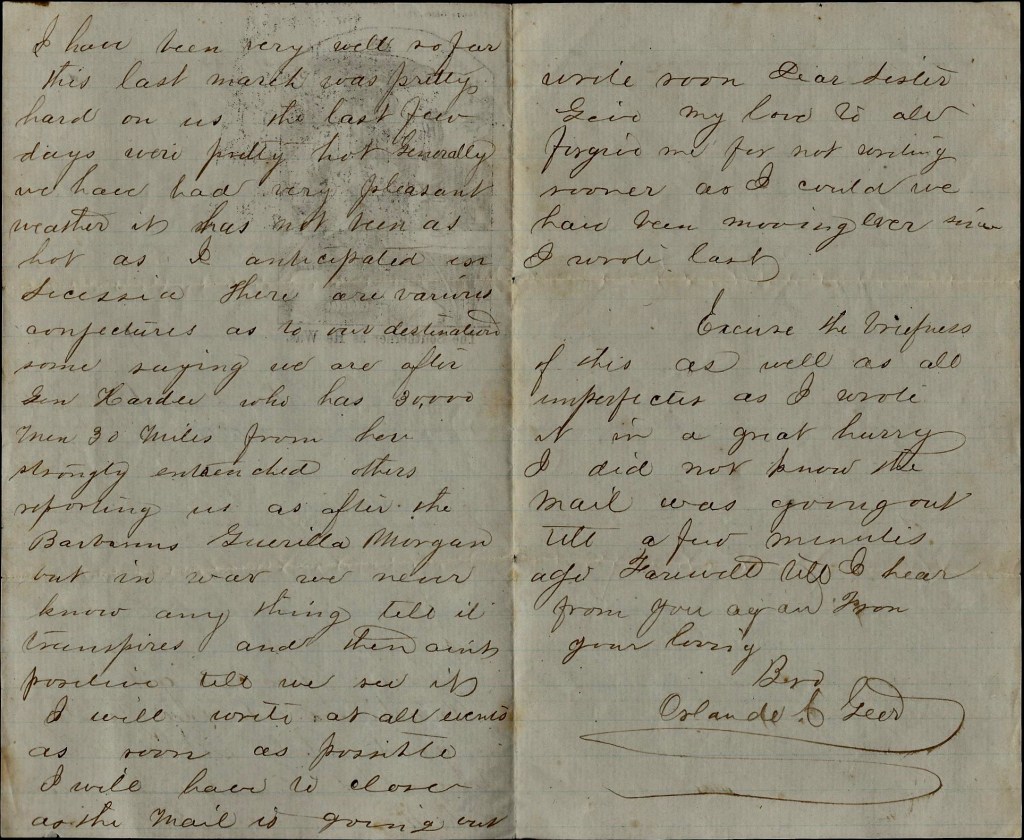 I have been very well so far. This last march was pretty hard on us. The last few days were pretty hot. Generally we have had very pleasant weather. It has not been as hot as I anticipated in Secessia. There are various conjectures as to our destination—some saying we are after Gen. Hardy who has 30,000 men 30 miles from here strongly entrenched; others reporting us after the barbarous guerrilla Morgan. But in war, we never know anything till it transpires and then ain’t positive till we see it.