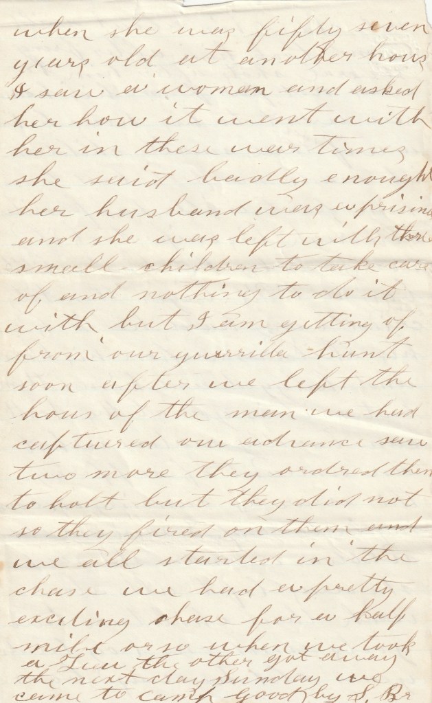 In coming into camp, I saw an old widow woman. She said she was left all alone with three children, two girls and one boy twelve years old. He was born when she was fifty-seven years old. At another house I saw a woman and asked her how it went with her in these war times. She said badly enough—her husband was in prison and she was left with three small children to take care of and nothing to do it with. But I am getting off from our guerrilla hunt.