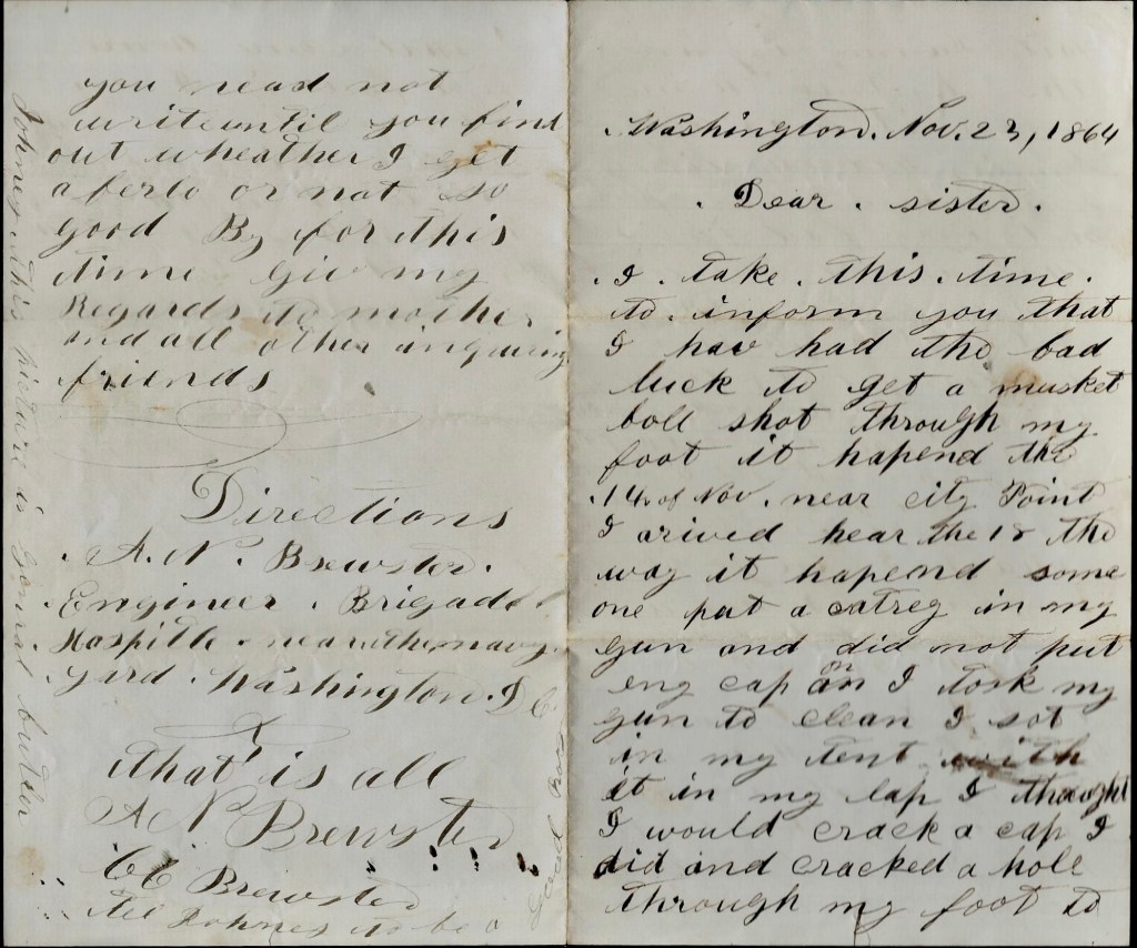 Brewster’s letter conveys the tragic news to his sister Cynthia that he accidentally shot himself in the foot while cleaning his gun at City Point, Virginia, and was transported to a hospital in Washington D. C. for treatment and recovery. “It will be a good while before I can work with it,” he told her. I couldn’t find a record of his discharge but the injury was most likely disabling—and while comical enough in his telling of the incident, it most likely proved fatal. He died in December 1865, just thirteen months after shooting himself.