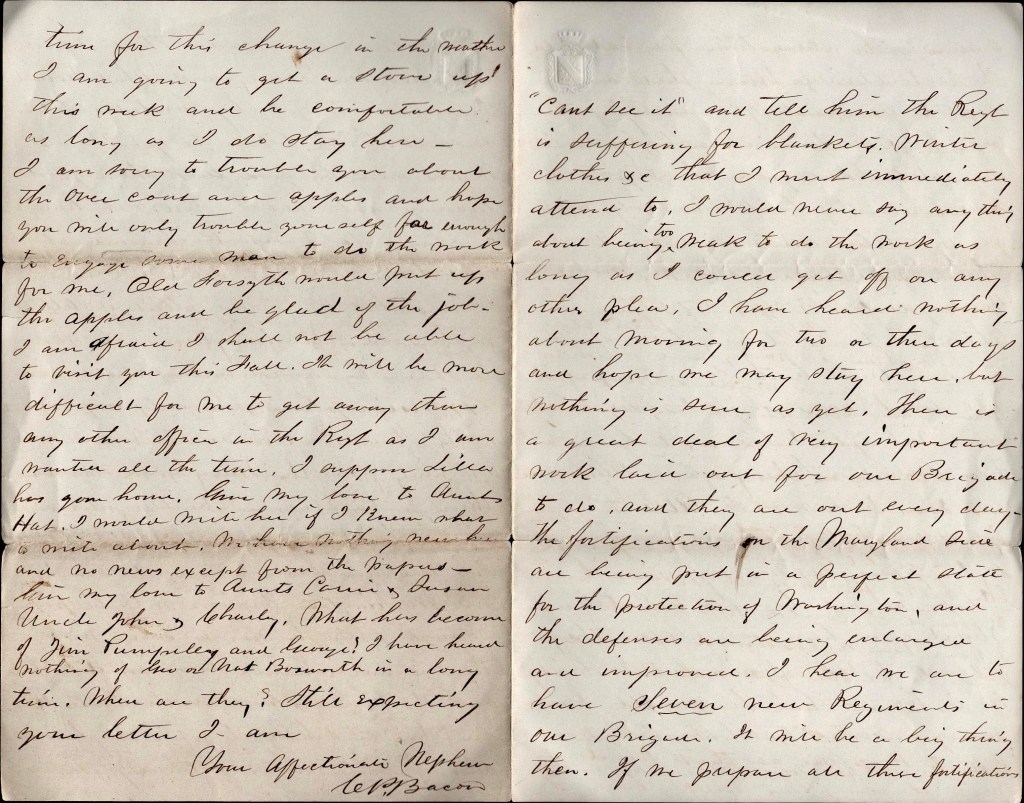 I am sory to trouble you about an overcoat and apples and hope you will only trouble yourself far enough to engage some man to do the work for me. Old Forsyth would put up the apples and be glad of the job. I am afraid I shall not be able to visit you this fall. It will be more difficult for me to get away than any other officer in the regiment as I am wanted all the time. I suppose Lilla has gone home. Give my love to Aunt Hat. I would write her if I knew what to write about. We have nothing new here and no news except from the papers. Give my love to Aunts Carrie & Susan, Uncle John, Charley. What has become of Jim Pumpelly and George? I have heard nothing of George or Nat Bosworth in a long time. Where are they? Still expecting your letter, I am your affectionate nephew, — C. P. Bacon
