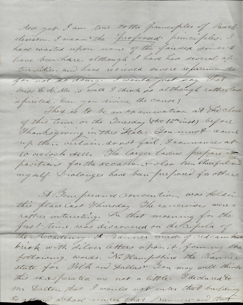 Having a little leisure before dinner, I thought I would improve it by writing you a few lines. Today here you will observe by a paper I mailed to you this morning, is a busy one. There is a great gathering of the Whigs of Louisiana beside a grand military parade, sham battle, &c. about going on at this moment—2 o’clock—and most of the business is stopped on account of it. Many stores closed.