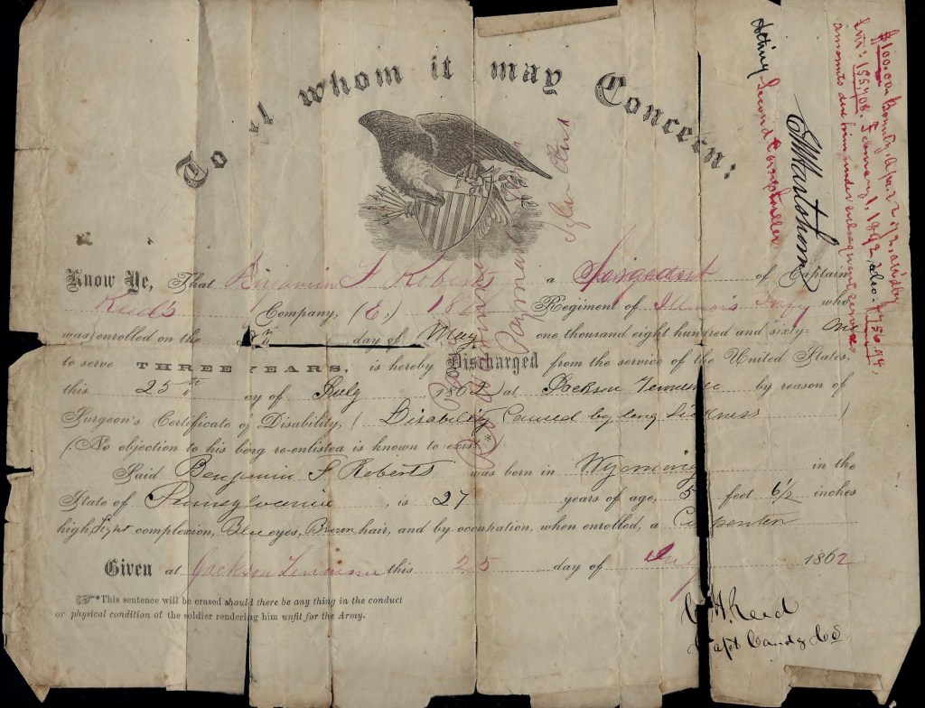 John Roberts’ actions in the battle no doubt earned him recognition and he was later commissioned a lieutenant by Captain Charles H. Reed. Also serving with him in the same company was his older brother, Sgt. Benjamin Franklin Roberts (b. 1835) who became seriously ill in the spring of 1862 and had to be discharged for disability in July 1862.
