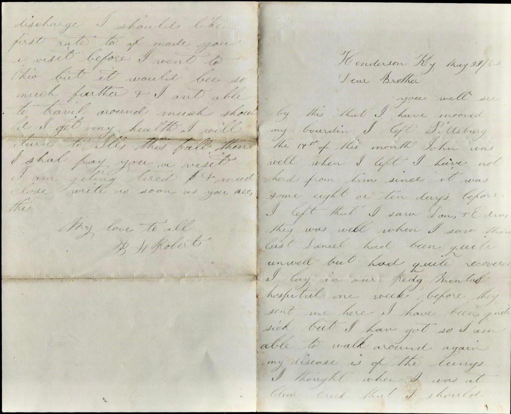 I have finally come to the conclusion that I will take a discharge as soon as I can get one for from experience I find I can’t stand the service. I expect I will remain here until I can obtain my discharge. This is a very pleasant place and considered very healthy. We occupy a large three-story brick building for our hospital here. Henderson is the county seat of Henderson county. It is one hundred and fifty miles above Paducah on the [Ohio] river. We have plenty to eat and kind attendance here although I want to get home for I think I would recover my health. I am tired taking medicine for I have taken so much the last year & done so little good that I have no confidence in it. I have written home since I came here but it is not time for an answer yet. I shall go home as soon as I get my discharge. I should like first rate to of made you a visit before I went to Ohio but I would be so much farther & I ain’t able to travel around much. Should I get my health, I will return to Illinois this fall. Then I shall pay you a visit. I am getting tired & must close. Write as soon as you see this.
