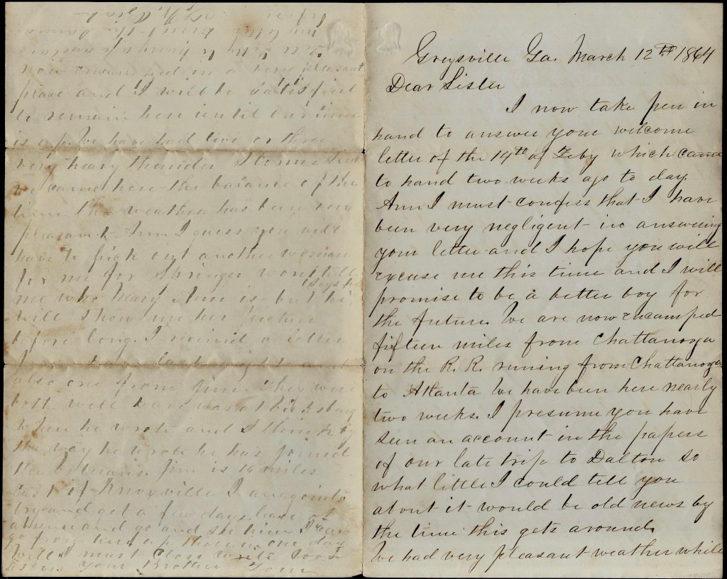 We are ow encamped fifteen miles from Chattanooga on the railroad running from Chattanooga to Atlanta. We have been here nearly two weeks. I presume you have seen an account in the papers of our late trip to Dalton so what little I could tell you about it would be old news by the time this gets around.