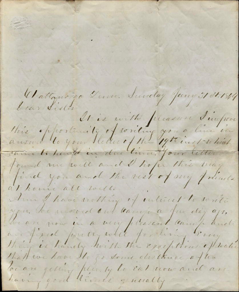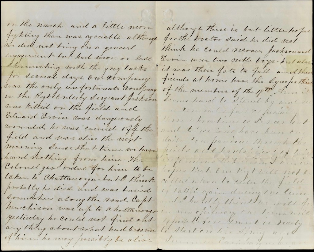 We had very pleasant weather while on the march and a little more fighting than was agreeable although we did not bring on a general engagement but had more or less skirmishing with the gray backs for several days. Our company was the only unfortunate company in the regiment. Orderly Sergeant [James] Jackson was killed on the field and Edward Ervin was dangerously wounded. He was carried off the field and was alive the next morning. Since that time we have heard nothing from him. The Colonel gave orders for him to be taken to Chattanooga but I think probably he died and was buried somewhere along the road. Capt. [Alexander] Murchison was up to Chattanooga yesterday. He could not find out anything about what had become of him. He may possibly be alive although there is but little hope for the doctor said he did not think he could recover. Jackson and Ervin were two noble boys. But alas, it was their fate to fall and their friends at home have the sympathies of the members of the 19th.