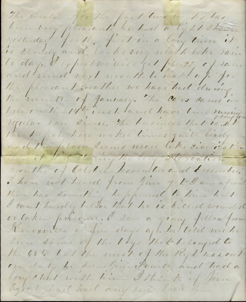 I have not hear from Jim yet. I am afraid there has something happened to him but I can’t hardly believe that he is killed, wounded, or taken prisoner. I saw a young fellow from Knoxville a few days ago. He told me he seen some of the boys that belonged to the 65th but the most of the regiment was out on duty. He saw Jim Powell and had a long chat with him. I think if Jim Oziah had had any bad luck, Jim Powell would have said something about it to this fellow. It was about four weeks ago that he seen Jim Powell.