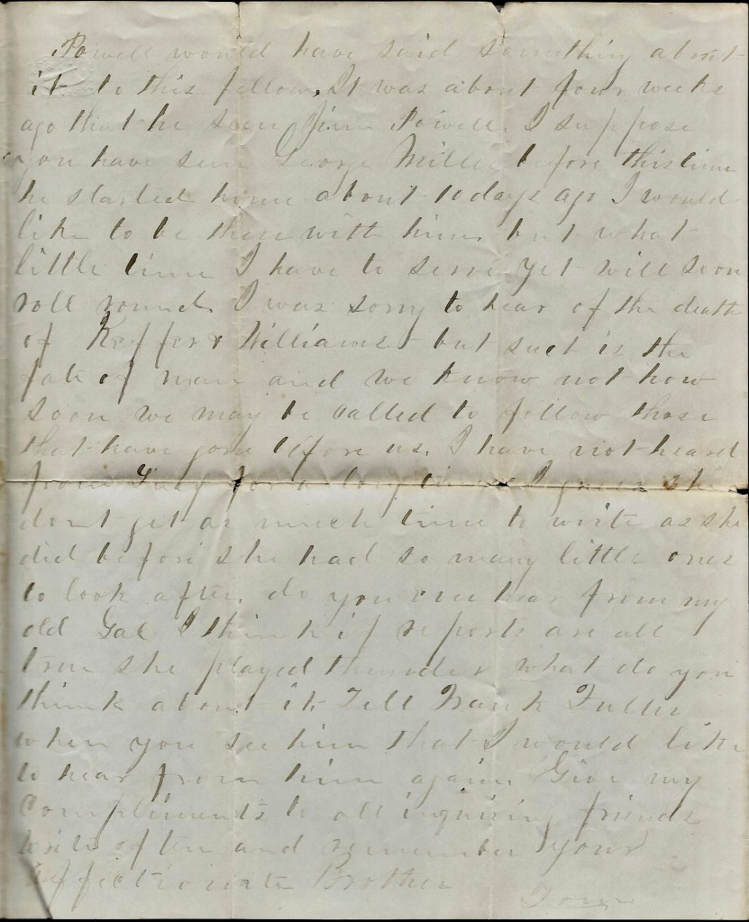 I suppose you have seen George Miller before this time. He started home about 10 days ago. I would like to be there with him but what little time I have to serve yet will soon roll round. I was sorry to hear of the death of Keffer &Williams but such is the fate of man and we know not how soon we may be called to follow those that have gone before us. I have not heard from Lucy for a long time so I guess she don’t get as much time to write as she did before. She had so many little ones to look after. Do you ever hear from my old gal? I think if reports are all true, she played thunder. What do you think about it?