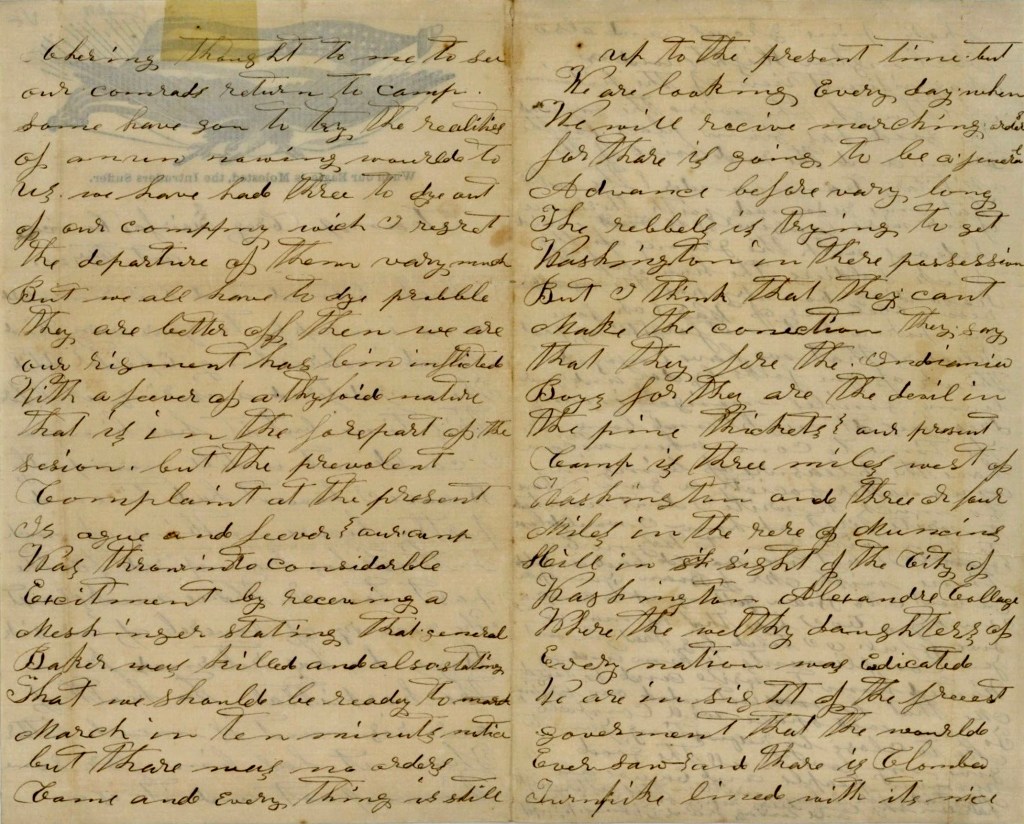 Our present camp is three miles west of Washington and three or four miles in the rear of Munson’s Hill in the sight of the City of Washington [and] Alexandria College where the wealthy daughters of every Nation was educated. We are in sight of the freest government that the world ever saw and there is Columbia Turnpike lined with its nice shady pine groves and also Arlington Heights and a magnificent view of the Potomac. Although the wise, the song and the good [?] has given place for the drum and the rude noise of the military commander, the walls that once resounded with the eloquence of our wise lawgivers is now made hideous with the groans of the sick soldiers [and] the houses of the resounding country has the resemblance of war.