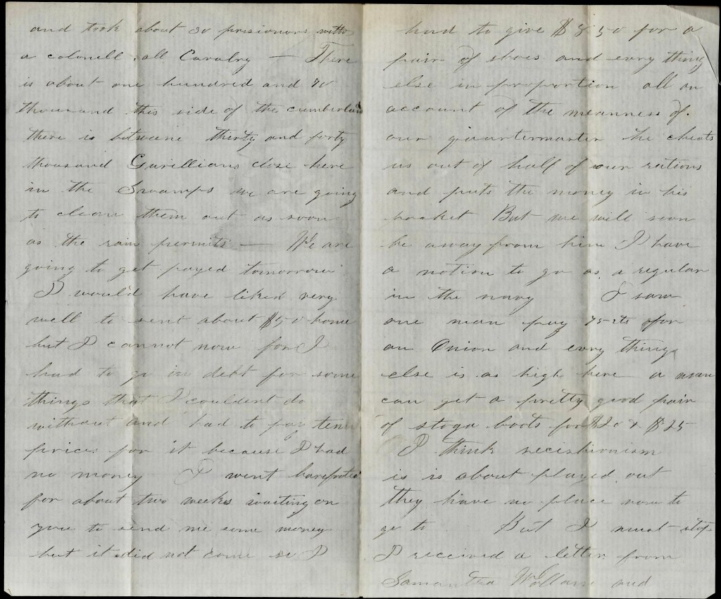 We are going to get paid tomorrow. I would have liked very well to sent about $50 home but I cannot now for I had to go in debt for some things that I couldn’t do without and had to pay ten prices for it because I had no money. I went barefooted for about two weeks waiting on you to send me some money but it did not come so I had to give $8.50 for a pair of shoes and everything else in proportion, all on account of the meanness of our quartermaster. He cheats us out of half of our rations and puts the money in his pocket. But we will soon be away from him. I have a notion to go as a regular in the navy.