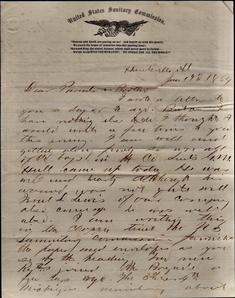 I wrote a letter to you a day or two ago, but as I have nothing else to do, I thought I would write a few lines to you this evening. I am well and getting along finely. So are all the boys in the company. Lieut. G. M. Hull came up today. He was well and hearty although his wound was not quite well. Israel D. Lewis of our company also came up. He was well also. I am writing this in the chapel [ ]. The U.S. Sanitary Commission furnishes the paper and envelopes as you see by the heading. Two new regiments joined the Brigade a few days ago—the 3rd & 4th Michigan—numbering about 1,000 men. Before they came into the Brigade, there was not more than 500 men [fit] for duty. Everything goes on finely and there is nothing that I want from home.
