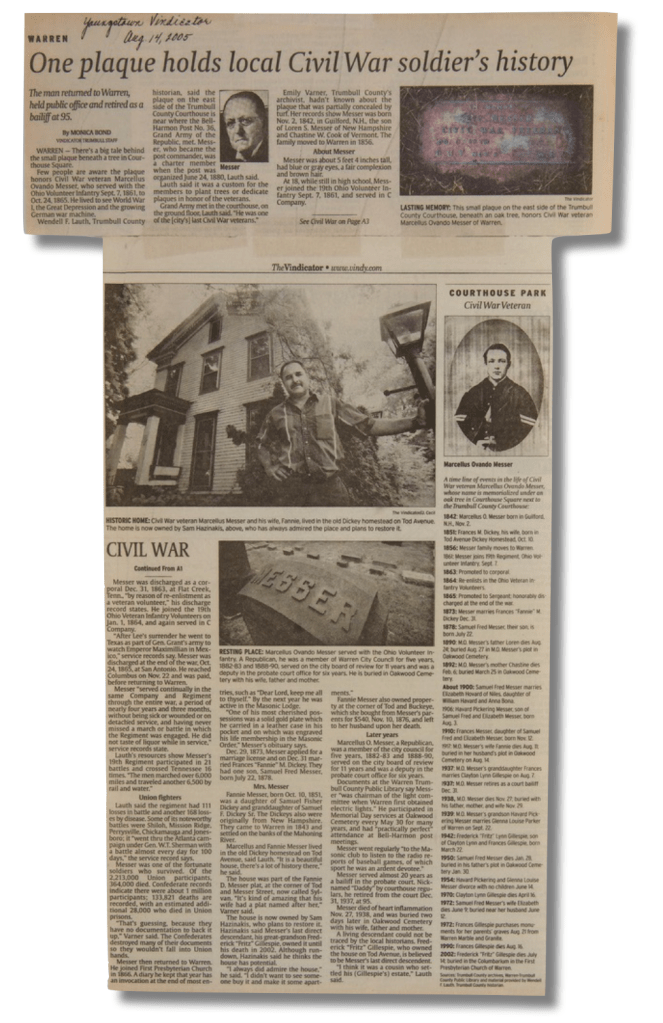 After the war, Messer returned to Warren, Ohio, and married Frances “Frannie” M. Dickey. They had one son and lived in the old Dickey homestead. Messer, a Republican, went on to serve as a member of the city council for five years in the 1880s and on other municipal boards. He also served as a bailiff in the Probate Court for more than 20 years.
