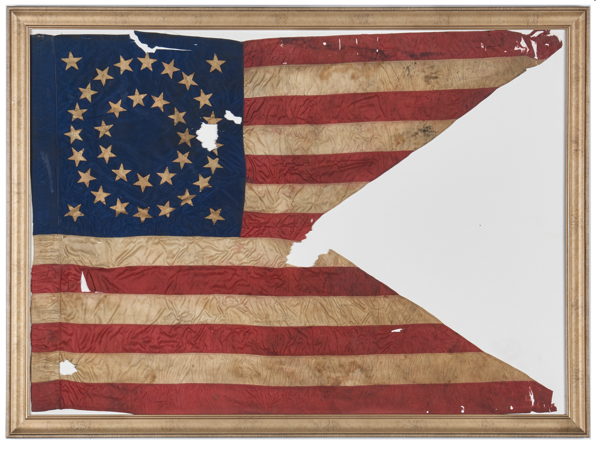 Civil War Union Cavalry Swallowtail Guidon Flag belonging to Corporal Marcellus Ovando Messer (1842-1938), 19th Regt., Ohio Volunteer Infantry, Company C. The silk flag has a double wreath of 35 gilt-painted stars, indicating use between the admission of West Virginia as a state in 1863, and the admission of Nevada in 1865; canton and stripes are pieced and treadle-sewn. 26 14″ x 36 3/4″ sight, 30″ x 40″ framed. Note: according to flag historian Greg Biggs, the U.S. contracted for more of these guidons than the cavalry could use, so standards like this one were issued to infantry regiments as guide flags, which were placed on the left and right flanks of the regiment to help form their line of battle. The battles in which the 19th Ohio engaged were among the war’s most infamous and included Shiloh, Missionary Ridge, and Chickamauga. They also participated in the Atlanta campaign, under General William Tecumseh Sherman. In all, the 19th regiment participated in 21 battles and crossed Tennessee 16 times, marching over 6,000 miles and traveling another 6,500 by rail and water. Cpl. Messer was born Nov. 2, 1842 in Guilford, New Hampshire. His family moved to Warren, Ohio when he was 14. When the Civil War broke out, Messer joined the 19th Ohio Volunteer Infantry, Company C., on Sept. 7, 1861 and was promoted to Corporal in 1863. According to his discharge record, he was discharged as a corporal on Dec. 31, 1863 at Flat Creek, Tennessee “by reason of re-enlistment as a veteran volunteer” and again served in C Company.