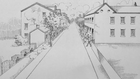 Artist’s rendering of the 3 Confederate soldiers firing on the Federals in front of the National Hotel in Henderson, Kentucky