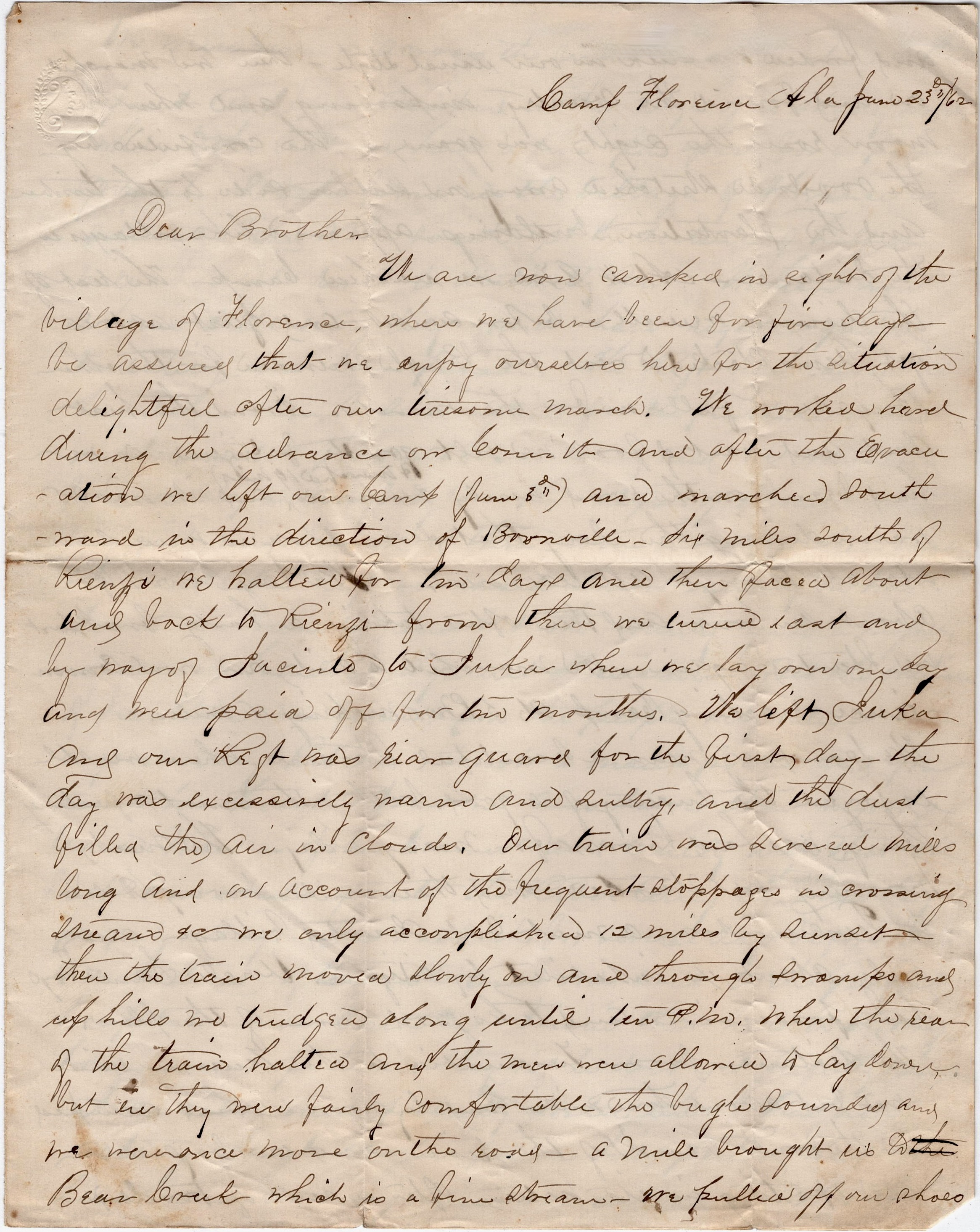 We are now camped in sight of the village of Florence where we have been for five days. Be assured that we enjoy ourselves here for the situation is delightful after our tiresome march. We worked hard during the advance on Corinth and after the evacuation we left our camp (June 3rd) and marched southward in the direction of Booneville. Six miles south of Rienzi we halted for two days and then faced about and back to Rienzi. From there we turned east and by way of Jacinto to Iuka where we lay over one day and were paid off for two months.