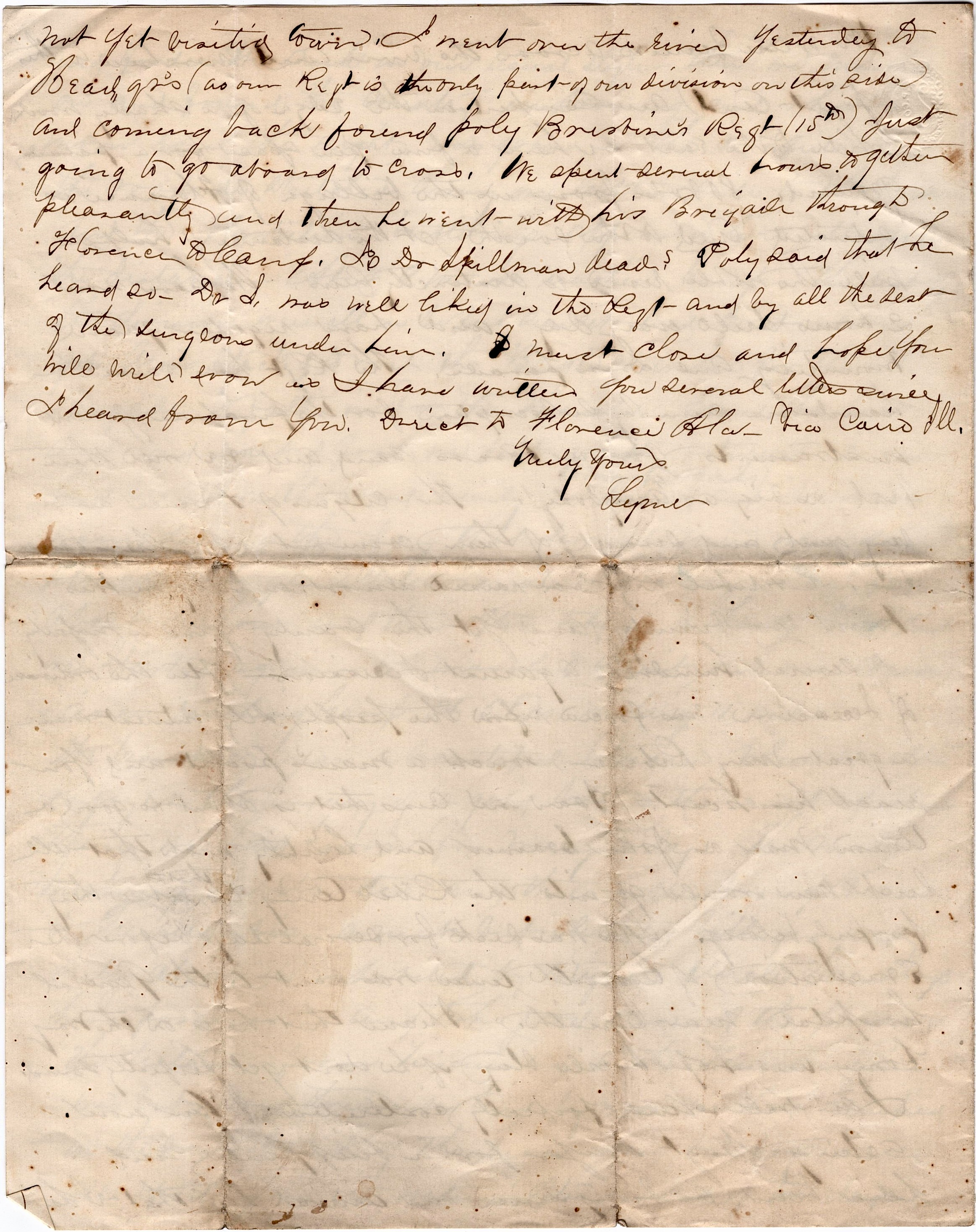 Is Dr. Spillman dead? Poly said that he heard so. Dr. Spillman was well liked in the regiment and by all the rest of the surgeons under him. I must close and hope you will write soon as I have written you several letters since I heard from you. Direct to Florence, Alabama via Cairo, Illinois.