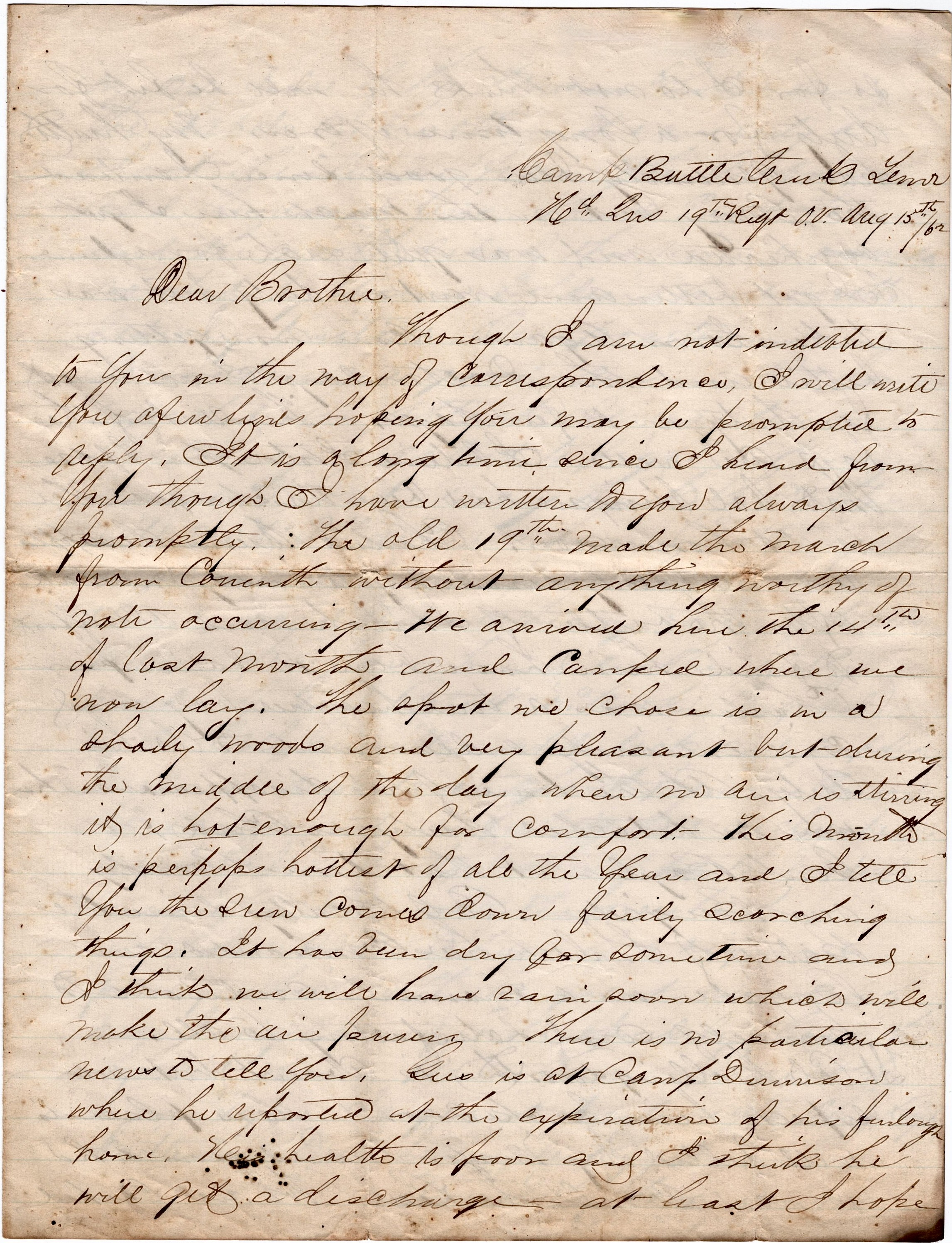 The Old 19th made the march from Corinth without anything worthy of note occurring. We arrived here the 14th of last month and camped where we now lay. The spt we close is in a shady woods and very pleasant but during the middle of the day when no air is stirring, it is hot enough for comfort. This month is perhaps hottest of all the year and I tell you, the sun comes down fairly scorching things. It has been dry for some time and I think we will have rain soon which will make the air purer. There is no particular news to tell you. Gus [Dilley] is at Camp Dennison where he reported at the expiration of his furlough home. His health is poor and I think he will get a discharge—at least I hope so for I do not think he will be fit for duty for a long time, if ever. My health has generally been good since I entered the army but on the march here I got overheated and was quite sick for a time. I got better and went on duty but was taken down again. Am now getting better and the Doctor says I will be fity for duty in a few days.