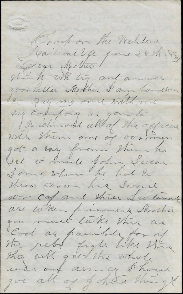 Mother, you must take this as cool as possible for if the rebs fight like this, they will get the whole of our army. I have got all of John’s things—all of his letters and everything—but mother, he is a prisoner. They took all of our company but 19 men but they did not get me. All I have to do is to care of their things and keep my old pack horse thins.
