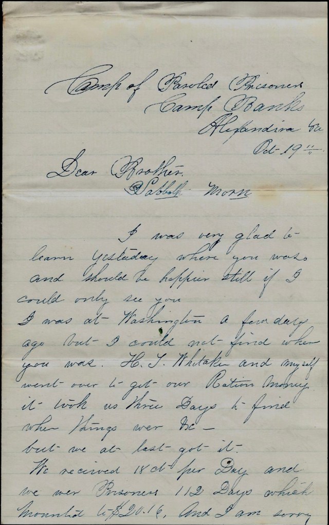 Your kind and welcome letters came to hand this morning and was glad to hear from you both again. I did not receive any mail from the time I left Washington until today and then I get 11 letters and this is the last I have to answer. We have not been here but a few days yet our work has been very hard, there being but a few troops here and the Rebs have been trying to break our center but in vain. We have lost but a few men and only one from our regiment.