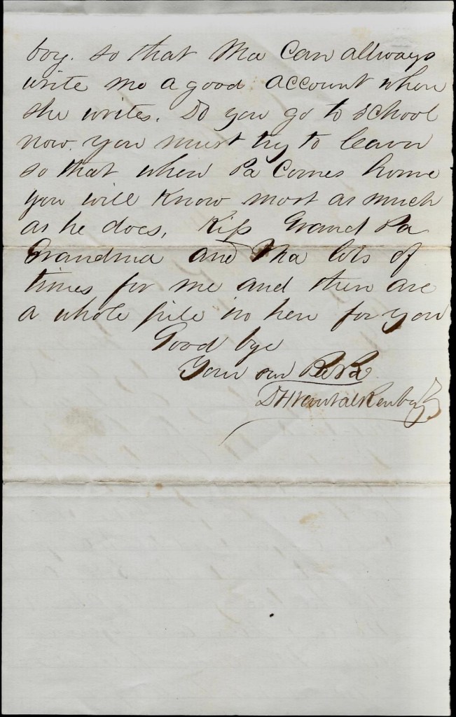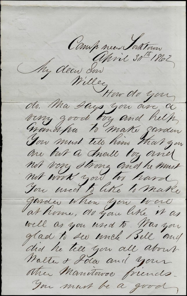 Emery, I want you to be a good boy & do all [you can] for your Mother. I can’t believe but what you will. There has some boys run away from home & come to the army but I will tell you how they stop it. When a boy [of] 15 or 16 is seen in a regiment, he is asked where he is from. He’s [then] reported to the Colonel [who] reports him to the marshal. If he won’t tell where he’s from, the marshal puts a ball on his leg that weighs 25 pounds, puts him in the lock up, lets them lay on the floor one night, and then they’ll tell their name & where they are from. The marshal then puts in handcuffs and sends him on the first train of cars to state he’s from [and to] the work house and then send a letter to his parents where….[end of letter is missing]
