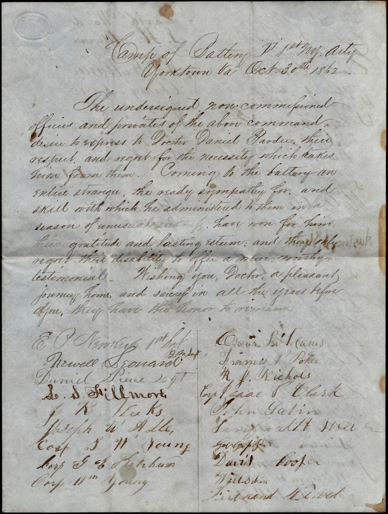 Nelson’s service record indicates that he was present with his battery at the following engagements: Lee’s Mills, Yorktown, Williamsburg, Fair Oaks, Seven Days, 2nd Bull Run, South Mountain, Antietam, Fredericksburg, Chancellorsville, Gettysburg, Thoroughfare Gap, Mine Run, Wilderness, Laurel Hill, Spottsylvania, North Anna, Cold Harbor, Petersburg, Weldon Railroad. He claimed he “was never sick one hour” and that he never spent any time in a hospital unless it was “to look after sick & wounded boys.”