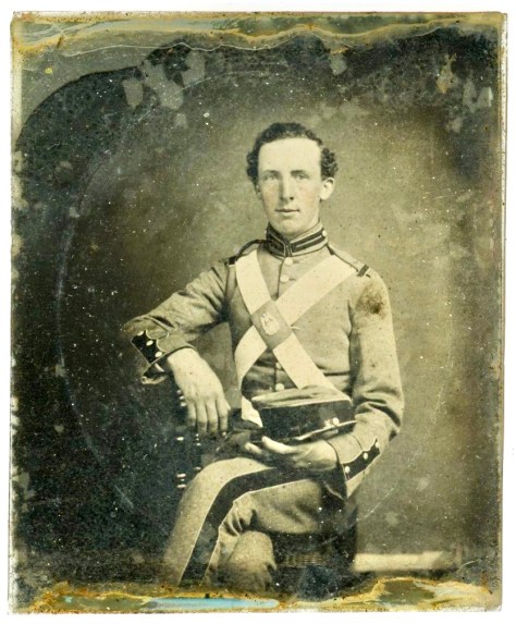 Sixth-plate ambrotype of an enlisted man of 21st New York Infantry in 1861. The 21st New York Infantry, or 1st Buffalo regiment, was recruited in Buffalo, and was the outgrowth of the 74th NYSM. It was mustered into the US service May 20, 1861, at Elmira, for three months and left there for Washington on June 18, 1861. The uniforms acquired by the 21st NY were originally purchased for the 74th NYSM from A. & G. Arnoux, of New York, by the Buffalo City Council. As that militia regiment was not required for three months’ service in 1861, the City Council sold the uniforms to the State which in turn issued them to the Buffalo Regiment on May 21. A report in the Buffalo Daily Courier of June 5 stated, “The uniforms of the 21st are at least 25 per cent better in quality [than State clothing] and one hundred in color.” According to Brigadier General H.R. White, who visited the military camp near Elmira, at this time, the 21st New York wore a “neat and finely fitting gray uniform… It is the same style as the regular State uniform—jacket, cap and pants alike—but fits the men beautifully.” In his regimental history, J. Harrison Mills described the uniform as consisting of “a cap, jacket and pants of gray cloth, trimmed with black, and an overcoat of bluish black lined with red.” After escorting the Buffalo Regiment to the railroad depot on their departure for Washington, D.C., a man in the 27th New York remarked that they “looked well, and very neat in their gray uniforms.” When the 21st reached the Federal capital on June 19, it was reported to be wearing “dark gray jackets, pants, and cap, trimmed with black.” Written in pencil in the case is “From O.[liver] B.[enton] Evans Gallery, Buffalo.” (Ron Field Collection)