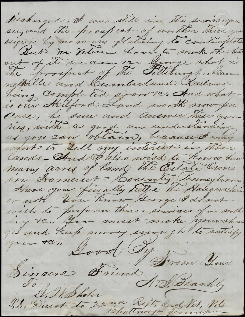 Monday 3rd. I chopped a cord of wood for Joseph and George Passmore; half of it beech and half of it gum. I have decided to leave here soon and go to Cincinnati and probably on to Uncle Thomas J. Myrer’s in Western Pennsylvania. My old Captain [Michael] Gooding of the 22nd [Indiana] Regiment, now Colonel of the same, came home a few days ago slightly wounded in the head. He received it in the Battle of Perryville in Kentucky. He told my brother Charley that I was a deserter and that he was going to take measures to affect my arrest immediately and send me to the army for severe punishment—probably to be shot. But I am going to take measures to make my escape if possible. I have been meanly treated by my regimental officers. I have expected to see the sheriff out after me every day since I made my escape from the Soldier’s Home at Indianapolis. Every time a small wooden bridge near our house rumbles by someone passing over it, I make haste to peep out to see whether it is the sheriff or not.