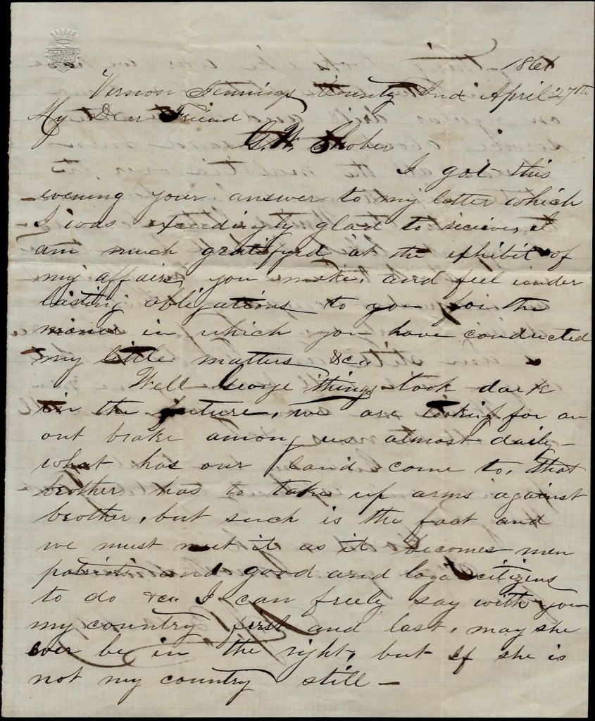 Sunday 2nd. I wrote the 24th chapter of the History of Benville. Was also reading a little in Tristram Shandy. In the evening I wrote two letters for a poor old mulatto living near named Dunken [Duncan] McDowell, commonly called “Old Dunk.” He has lately become slightly insane and one of the letters which I wrote for him was an earnest appeal to “His Excellency Abraham Lincoln,” to put his late Emancipation Proclamation in immediate force, or else give the negroes the power to fight for their liberty. 1