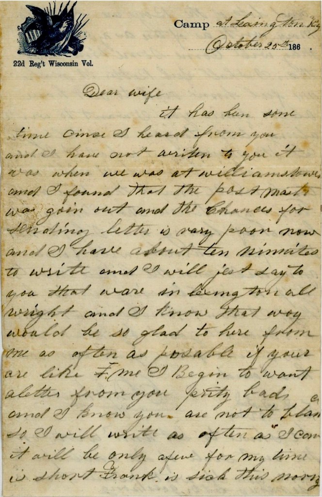 Orson wrote this letter from Lexington, Kentucky, after having been on the march from Cincinnati since the 7th of October, moving every few days until arriving in Lexington. They were there until the 31st of October and then moved on to Nicholasville where they were assigned provost guard duty until mid-December.