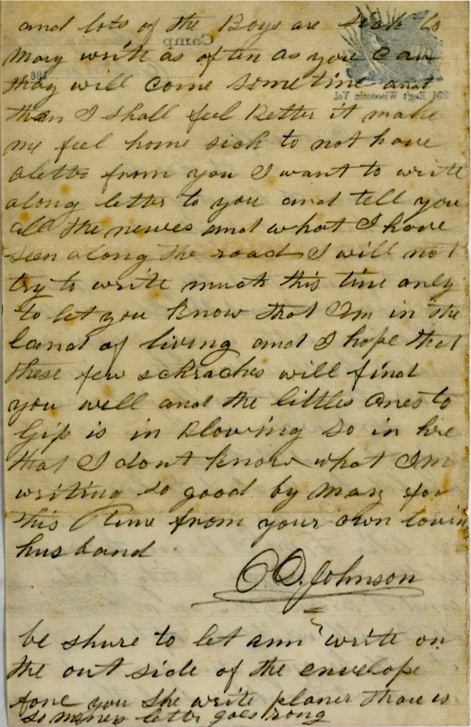 Gip is in blowing so in here that I don’t know what I’m writing. So goodbye, Mary, for this time. From your own loving husband, — O. D. Johnson