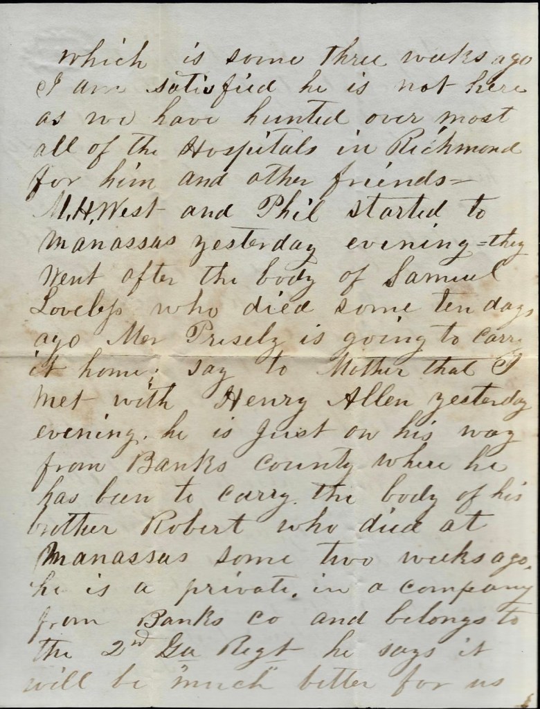 W. H. Little says tell Mollie that he is well and he says tell her that he wants to see her very bad. And tell her that he is doing better than he ever did before in the war for he gets plenty to eat. He says tell her that he is so sleepy he can’t write today but he will write soon. He says give his love to all of the family and tell them to write to him. Hand this to Mollie.