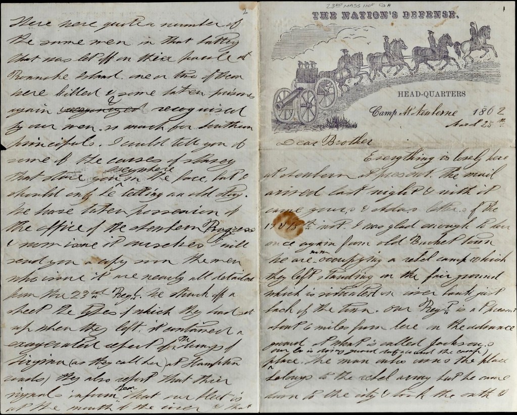 The following letter was written by Charles L. Thompson (1838-1890), a carpenter from New Bedford, Massachusetts, who volunteered to serve in Co. D, 23rd Massachusetts Infantry. He mustered in as a private on 28 September 1861 and rose in rank to sergeant, quartermaster sergeant, and finally to 2nd Lieutenant, though he was never mustered in as an officer before leaving the service in 1865.