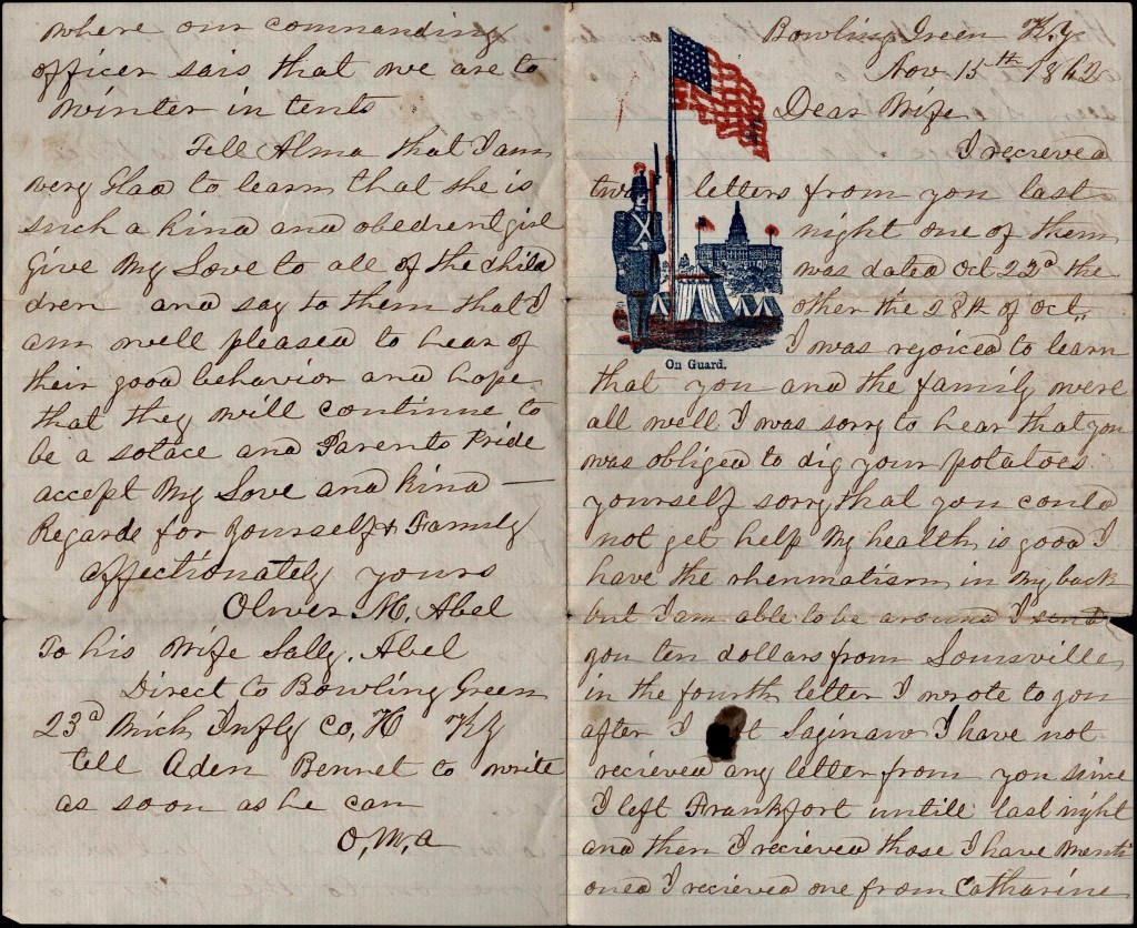 This letter was composed by Oliver M. Able (1820-1883), the progeny of William Abel (1796-1880) and Alma Sager (1805-1861). In October 1842, Oliver entered into matrimony with Sally L. Ferris (1822-1900). The couple engaged in agriculture in Perry, Shiawassee County, Michigan, and by the time Oliver, then 42 years old, enlisted on 13 August 1862 as a private in Company H, 23rd Michigan Infantry, they had borne as many as eight children. In his letter, written three months into his three-year term of service, he conveyed his struggles with rheumatism, which compelled him to seek a disability discharge, ultimately granted on 20 February 1863 in Bowling Green, Kentucky.